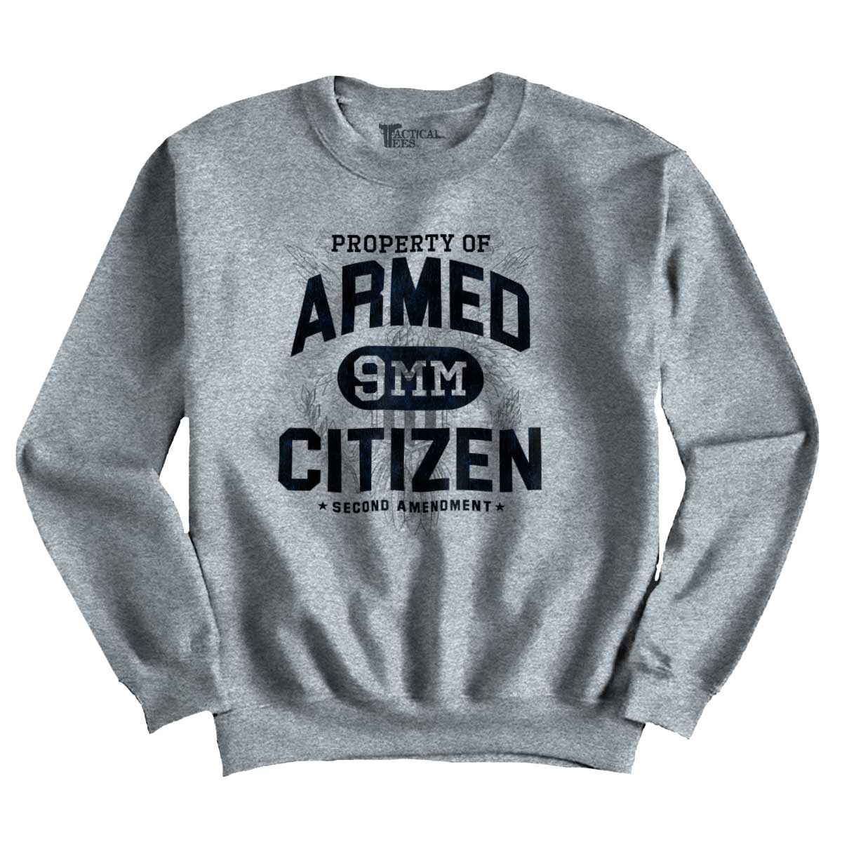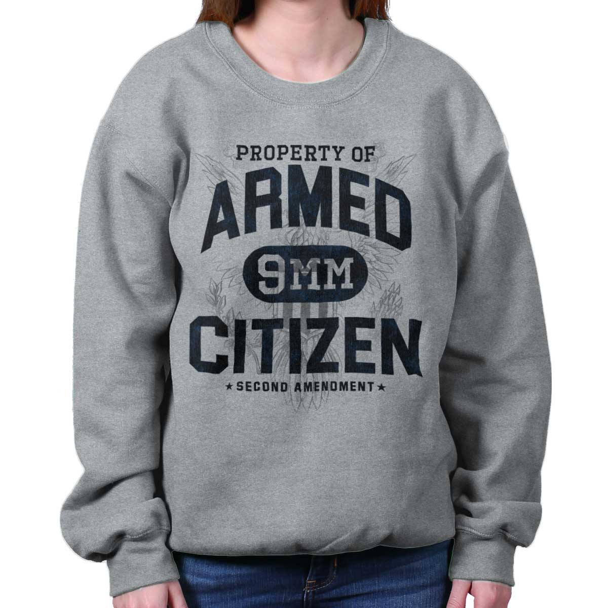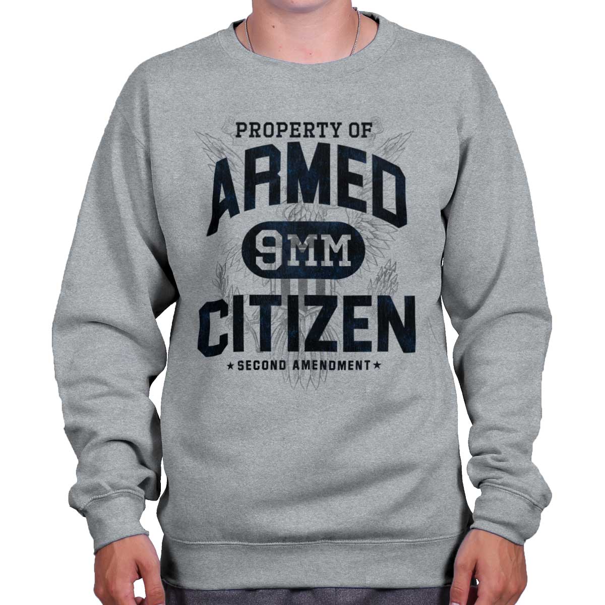 This Crewneck Sweatshirt is officially the property of an Armed Citizen. We couldn’t get any legal documentation to make it official, but we tried to make it look as cool as we could. Designs like these can tend to get a bit pretentious, but this one isn’t because it’s about gun ownership. There really isn’t anything less pretentious than a gun, especially when you’re staring down the barrel of it. We threw “9mm” on there because these types of designs look more “official” with numbers and establishment dates. We should probably stop sharing industry secrets.